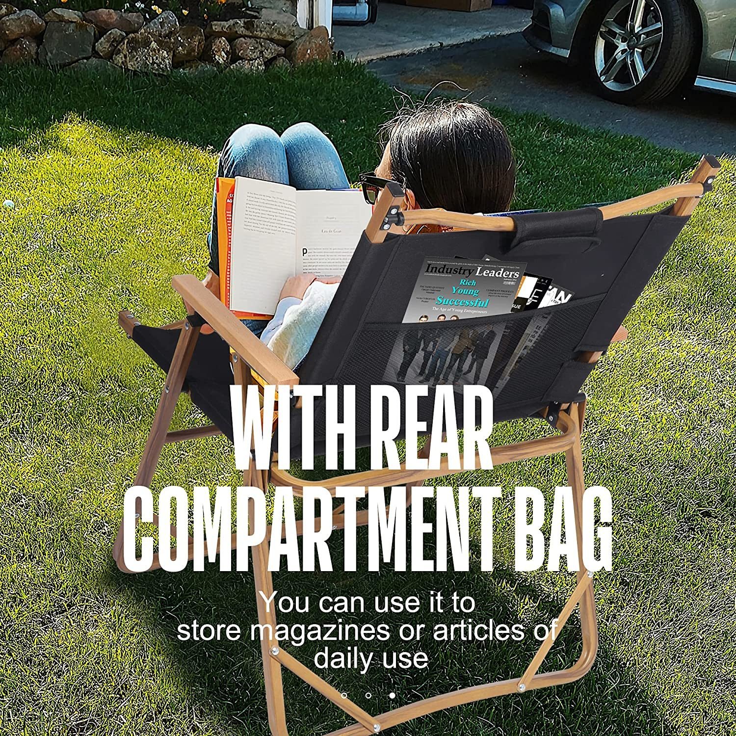 There is a multi-functional back pocket; you can store magazines or articles of daily use and to be carried at any time; practical and convenient.Our collapsible chair can be folded to 24.8" x 20.8" x 2.8"; easy to storage.Stored behind the door; in the corner; under the bed; also in the truck for outdoor use.Wood grain aluminum bracket; weight: 5.7LBS; with a bind belt can be used to tie the chair and increases the contact area of the grip to reduce the pressure.The seat is made of high density 600D Oxford Cloth; which is wear resistant and breathable; can support 265lbs(120kg). The bottom of the frame has 4 triangular structure to reinforce; more stable and safer.Set of 2; Size: 20.8" x 17.7" x 26.4". You can use this folding chair for both outdoor and indoor. Such as camping; fishing; BBQ; garden; lawns; park; music festival and anywhere you need.Specification: