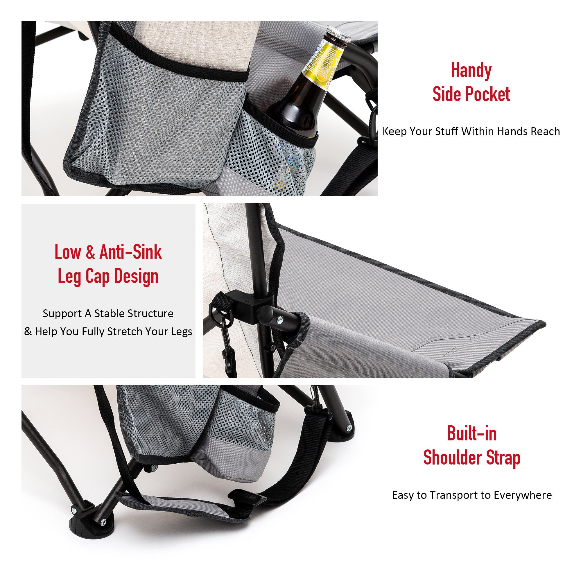 Extremely Comfy & Space Saving: The low seat beach chair seat & anti-sink leg cap & armrest design provide you an ultimate soft seating experience.The breathable and cooling mesh back design makes sitting for long comfortable for you. The small folding size (29×7.5×7 inches) saves your room while not on duty.